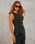 Clean lines, confident look. This two-piece set pairs a sleeveless, button-through denim vest with full-length, wide-leg trousers for a sharp, modern silhouette. Cut in solid-colour denim, it delivers structure without fuss and styles effortlessly from weekday to weekend.
