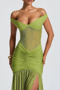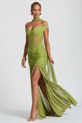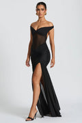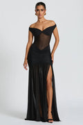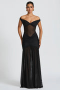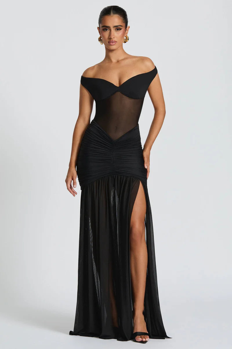 Turn heads in this off shoulder ruched mesh maxi dress, a striking piece that blends elegance with modern allure. Designed with a flattering off shoulder neckline, a sheer mesh bodice and delicate ruching through the waist, it enhances the silhouette with confidence and style.