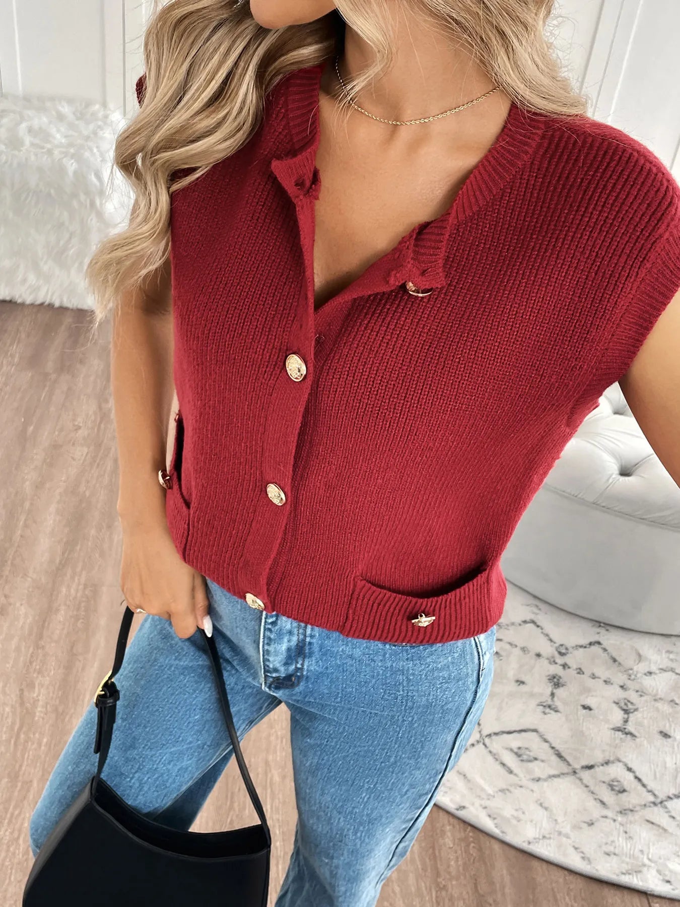 Red Knitted Sleeveless Cardigan
