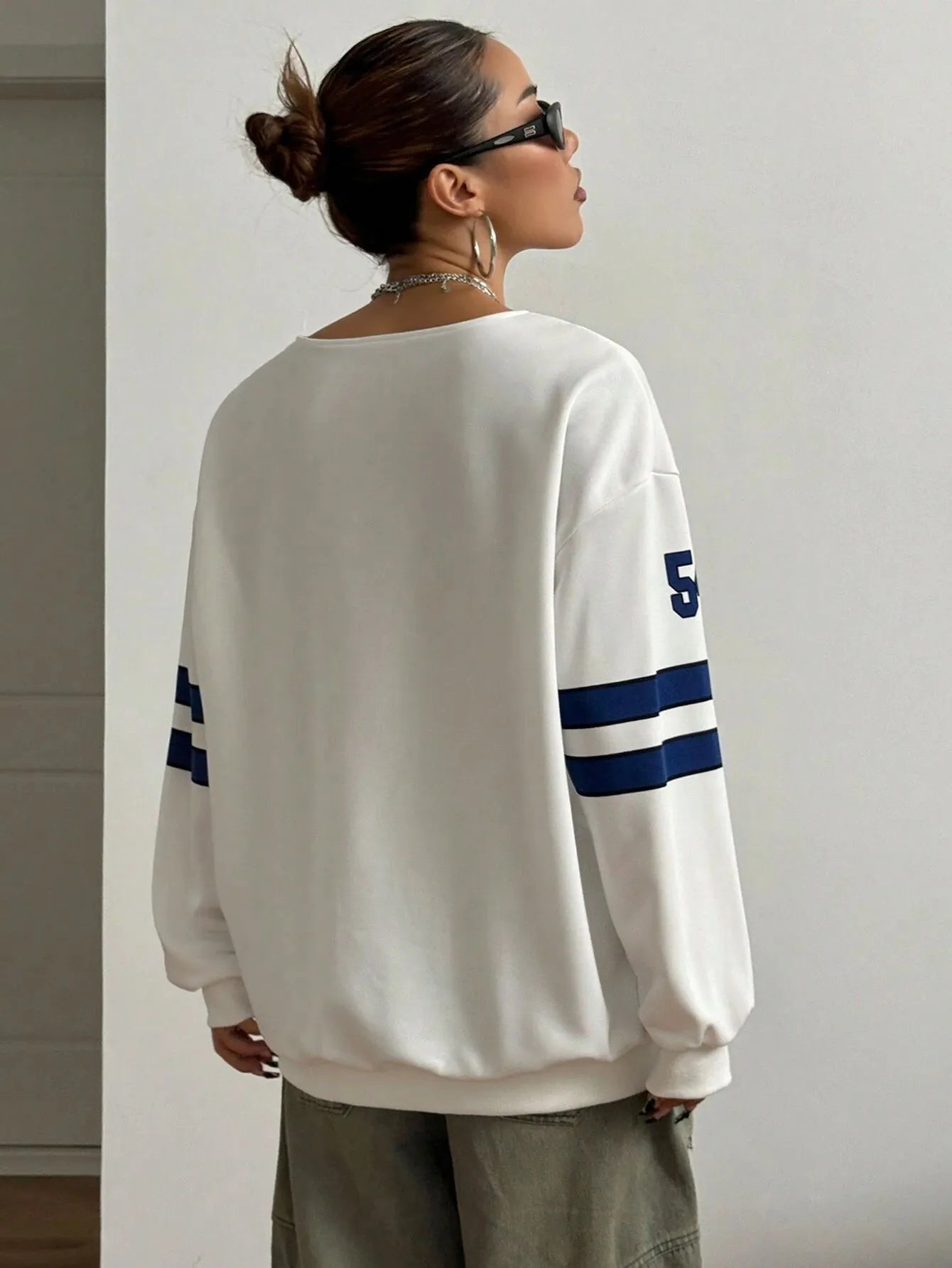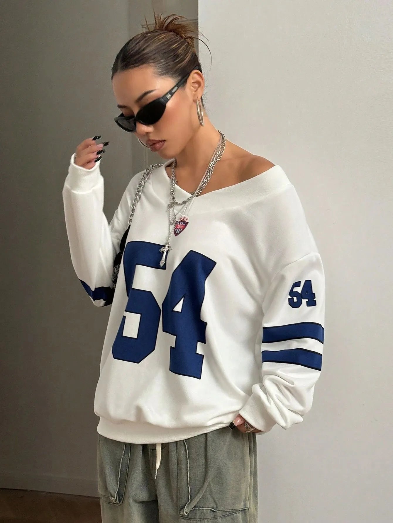 Channel effortless street style with this white oversized V-neck sweatshirt, featuring bold navy number and stripe prints. Designed in a loose fit with dropped shoulders, it delivers relaxed comfort and a confident, sporty edge.